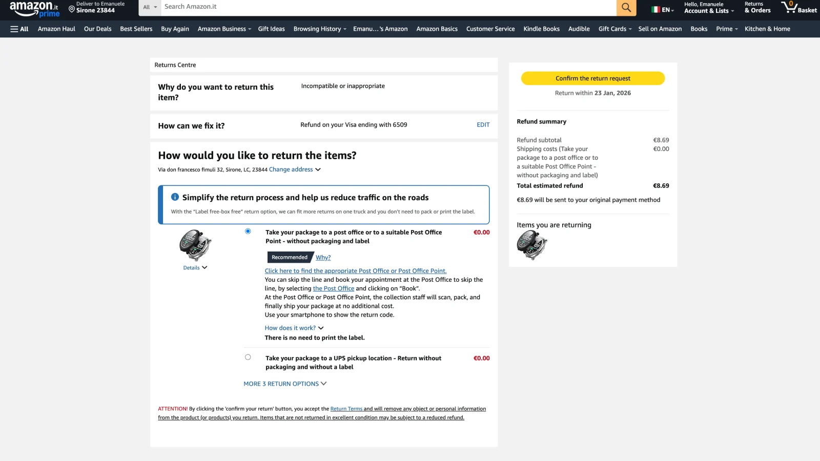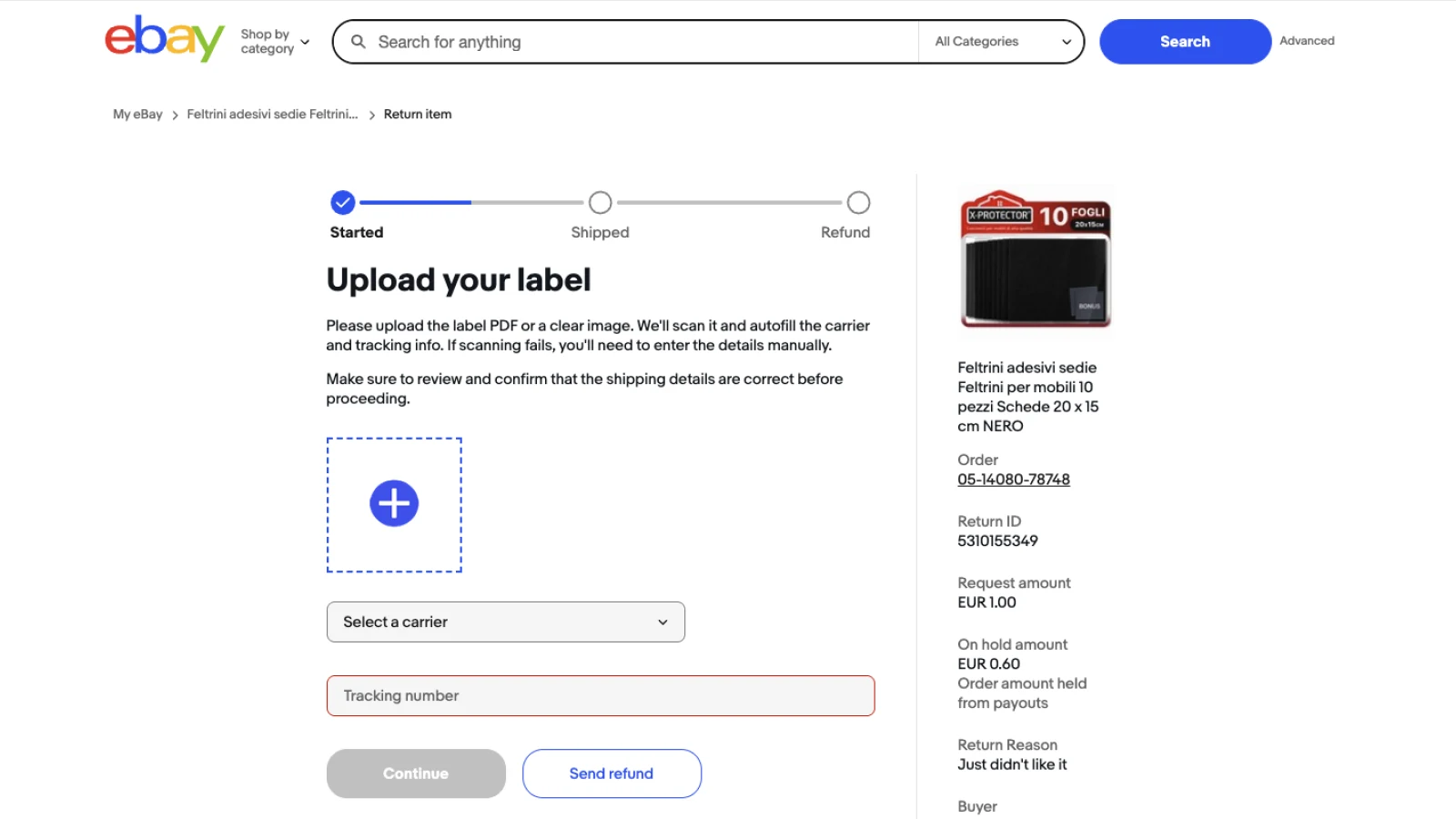 Amazon usually offers multiple return options. Always pick a free method: a drop-off point (no packaging needed) or home pickup at the buyer's address. For home pickup, coordinate the address with your eBay buyer before confirming.
