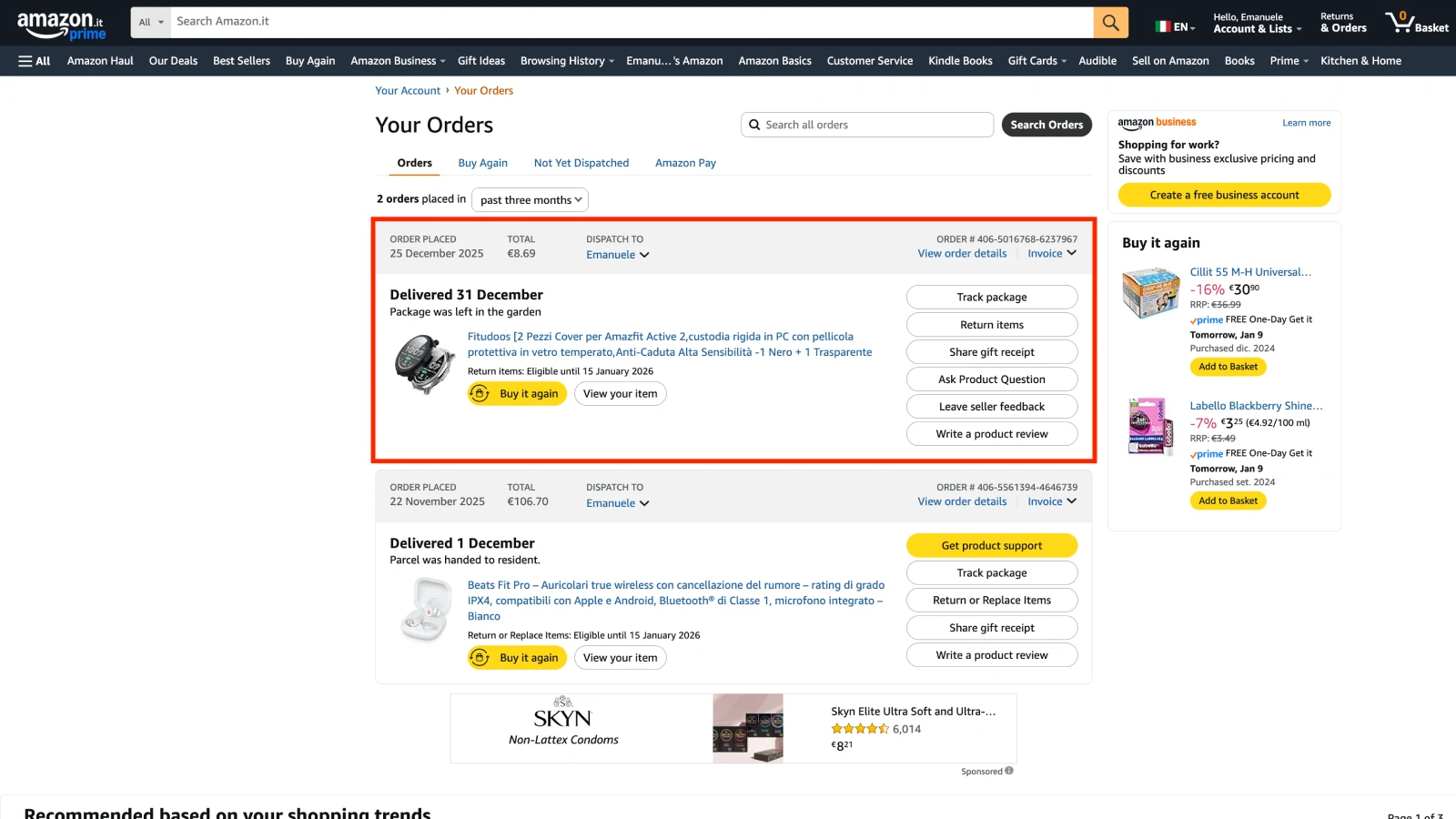 Log into the correct Amazon account. Use the order number from the Droopify orders panel to locate it in the purchase history.