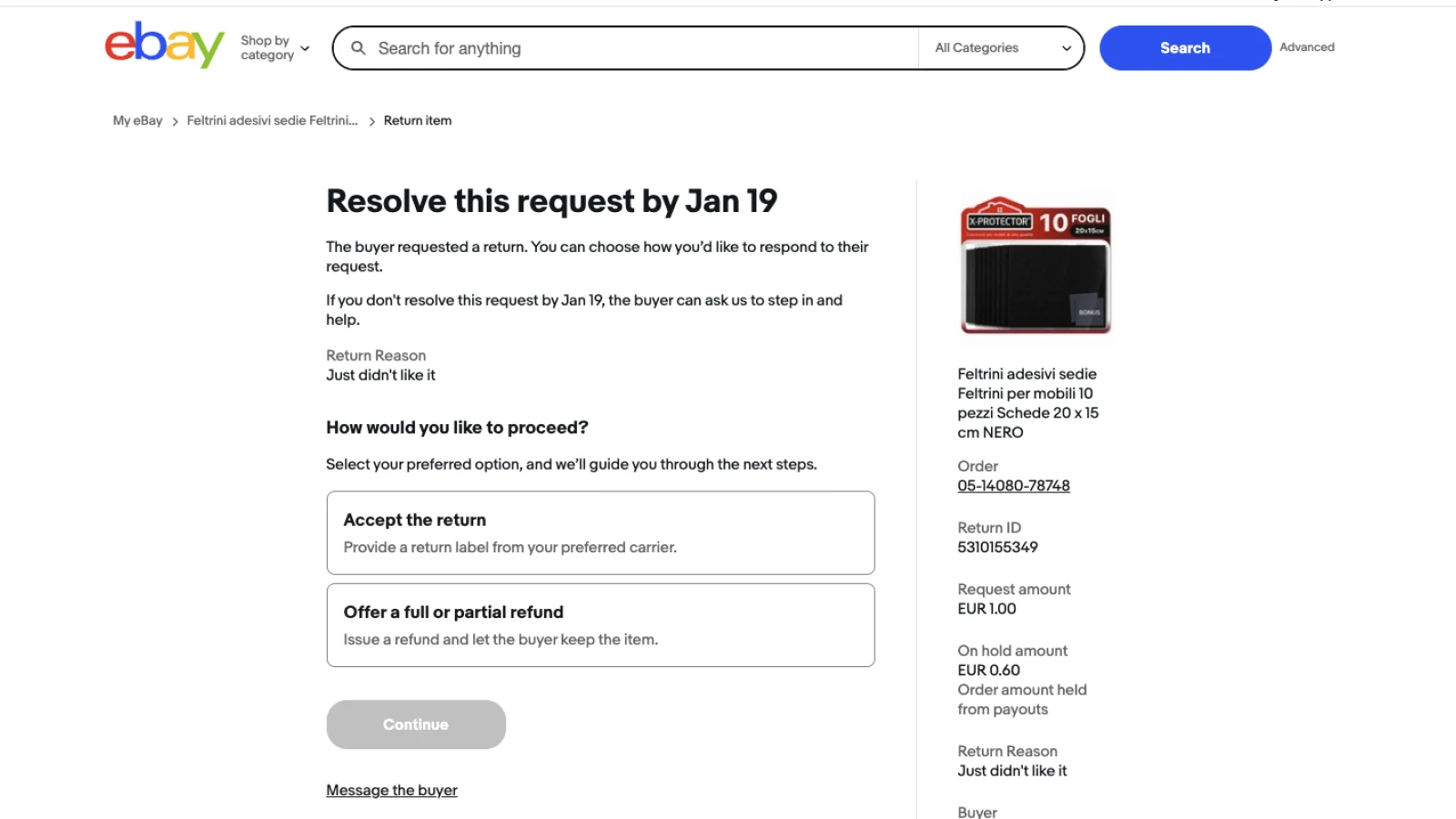 Not every return request should be handled the same way. The two values to protect are your eBay reputation (no defects, no negative feedback) and your margin (no unnecessary losses). The right call depends on the specific situation.