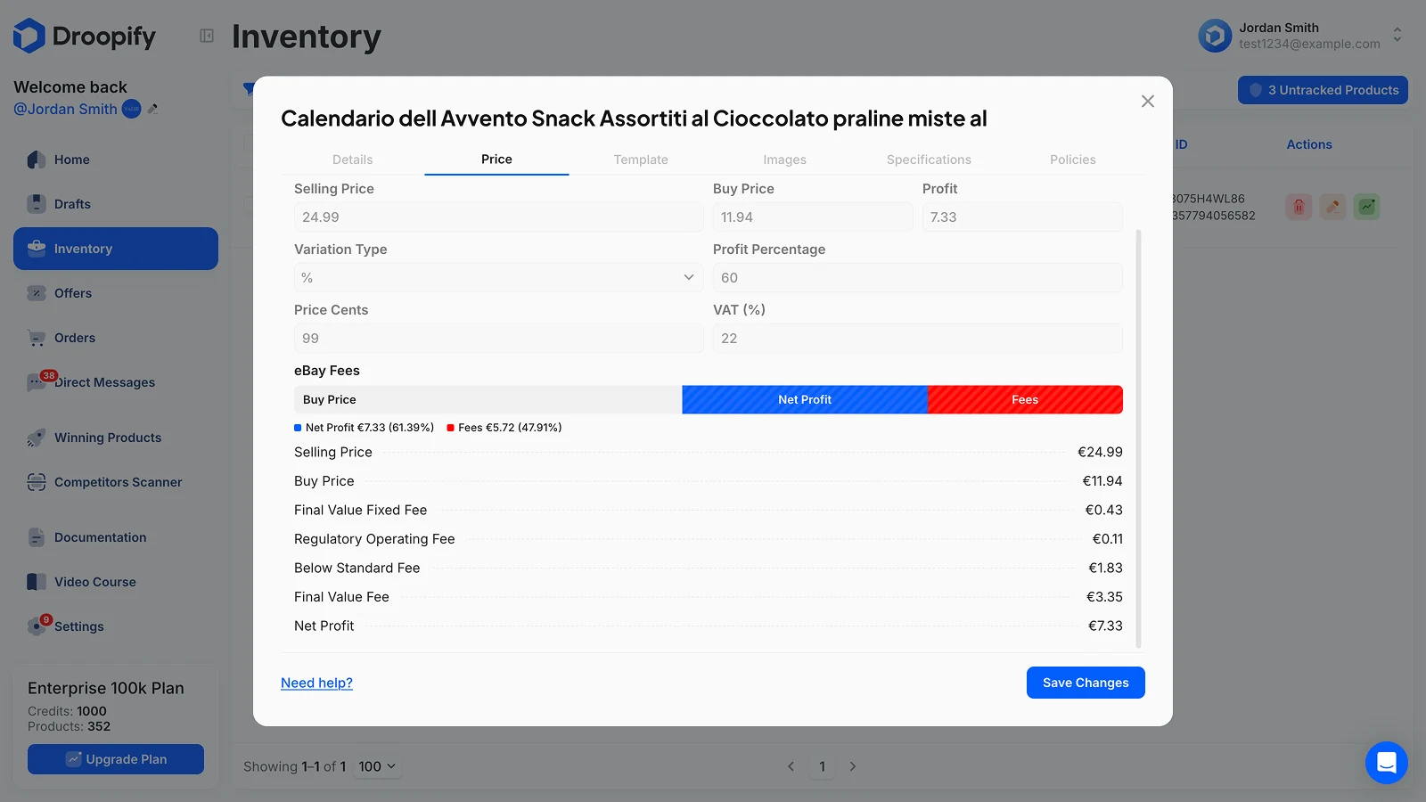 Droopify risolve questo calcolo con il Calcolo Profitto Netto e Commissioni eBay, feature unica sul mercato che mostra il margine reale prima di pubblicare e aggiorna ogni inserzione quando il fornitore cambia costo. Vedi il Dettaglio Profitto Netto.