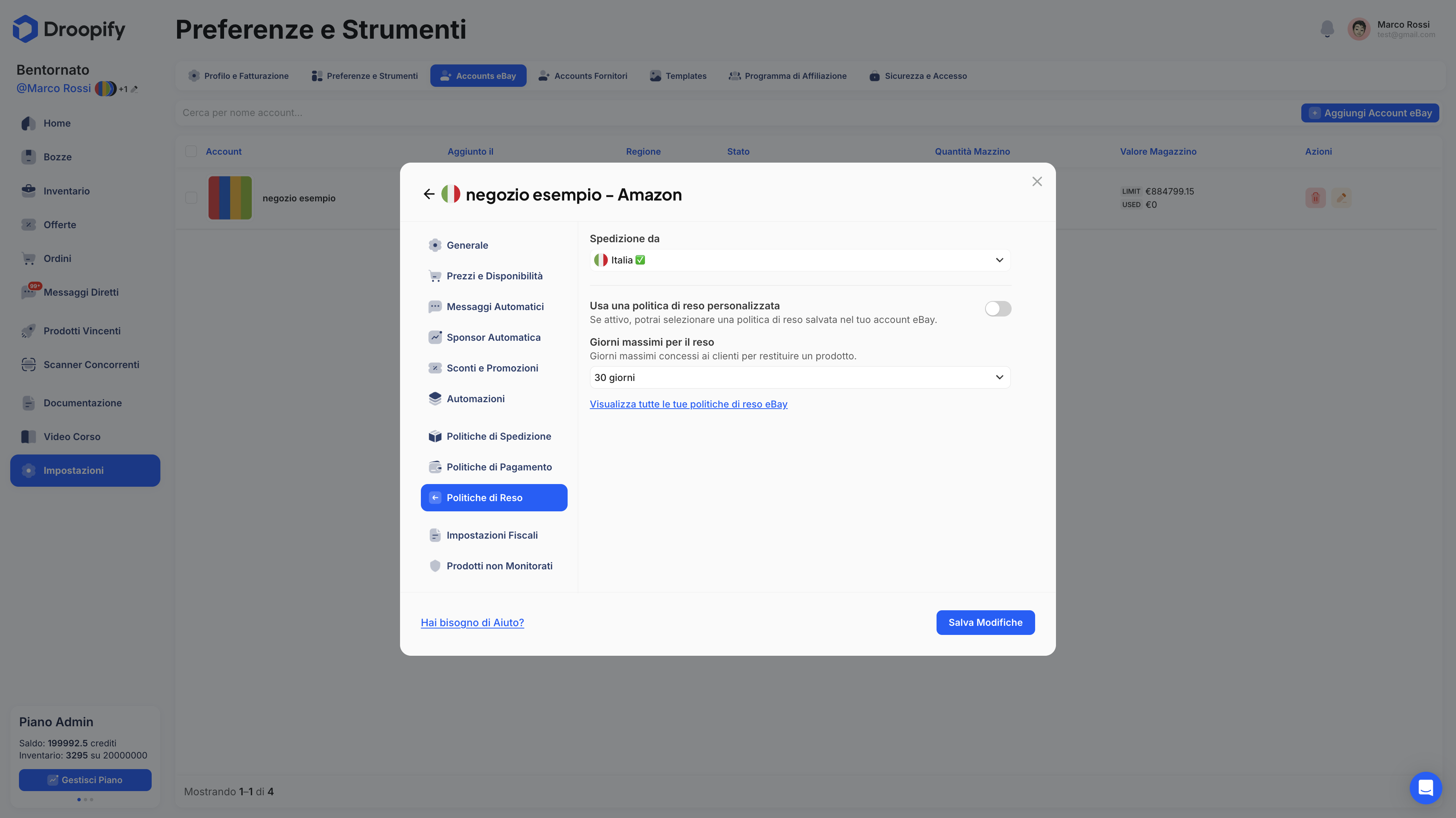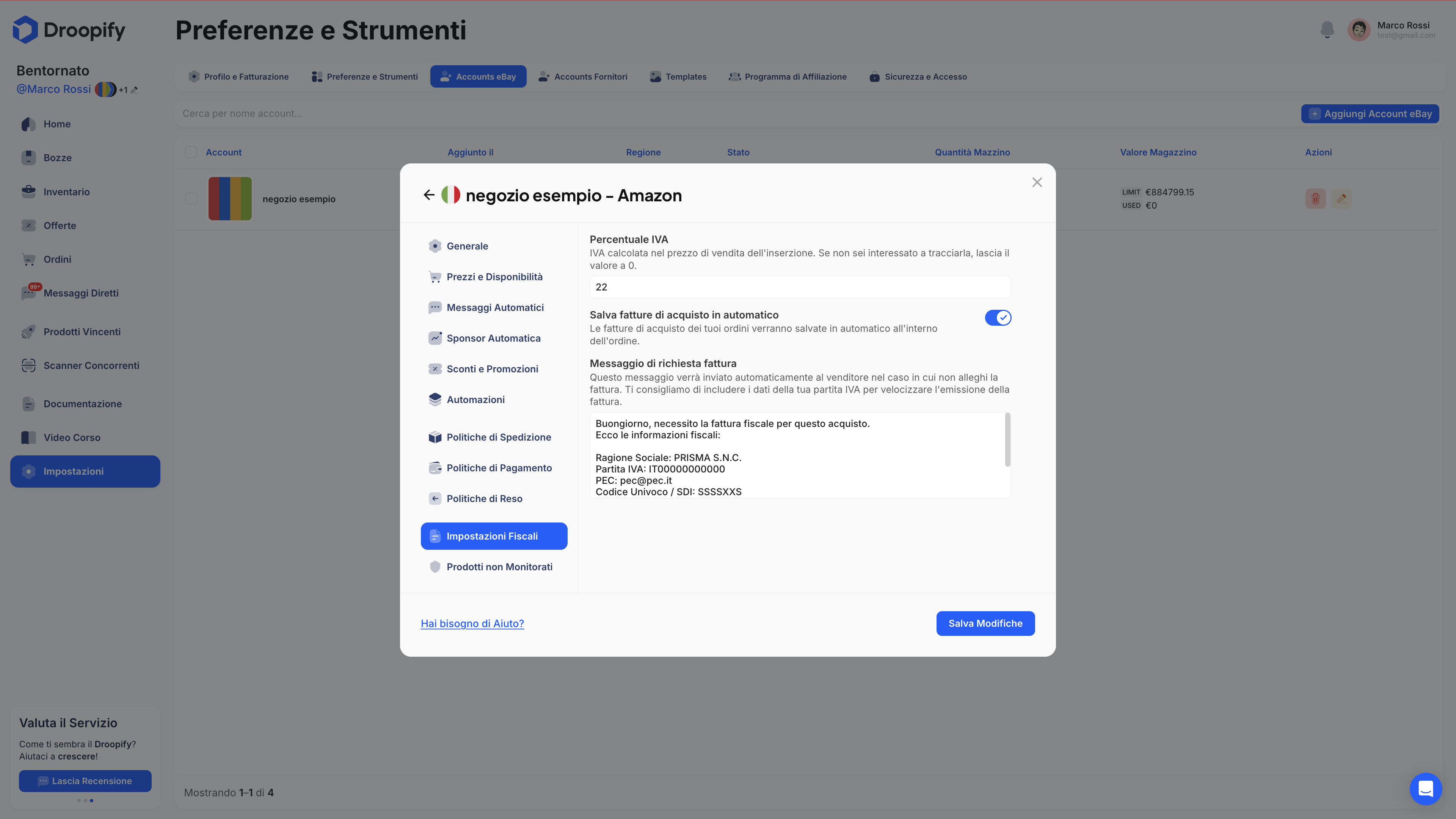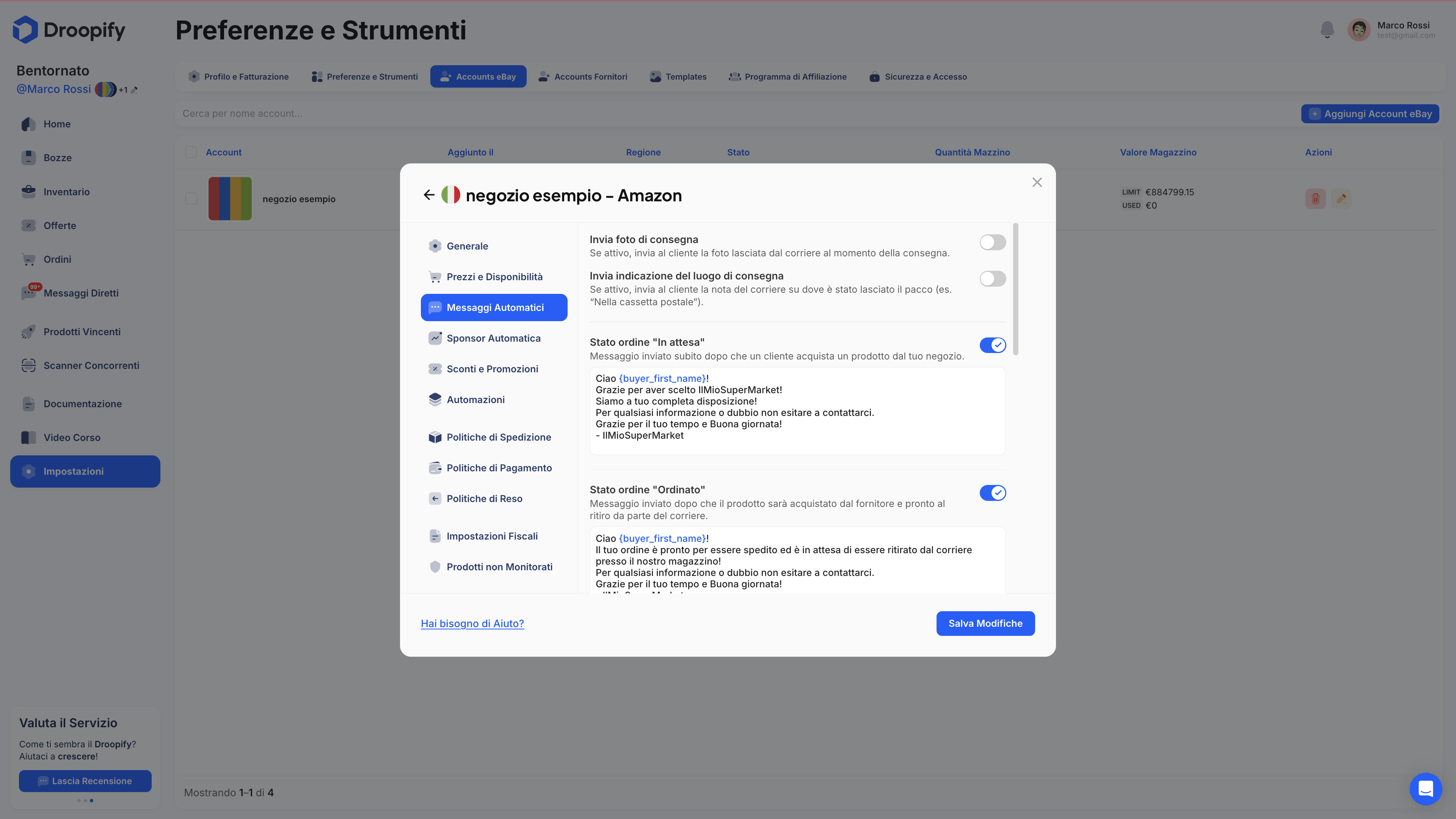 Per modificare le impostazioni di un account eBay collegato a Droopify:
