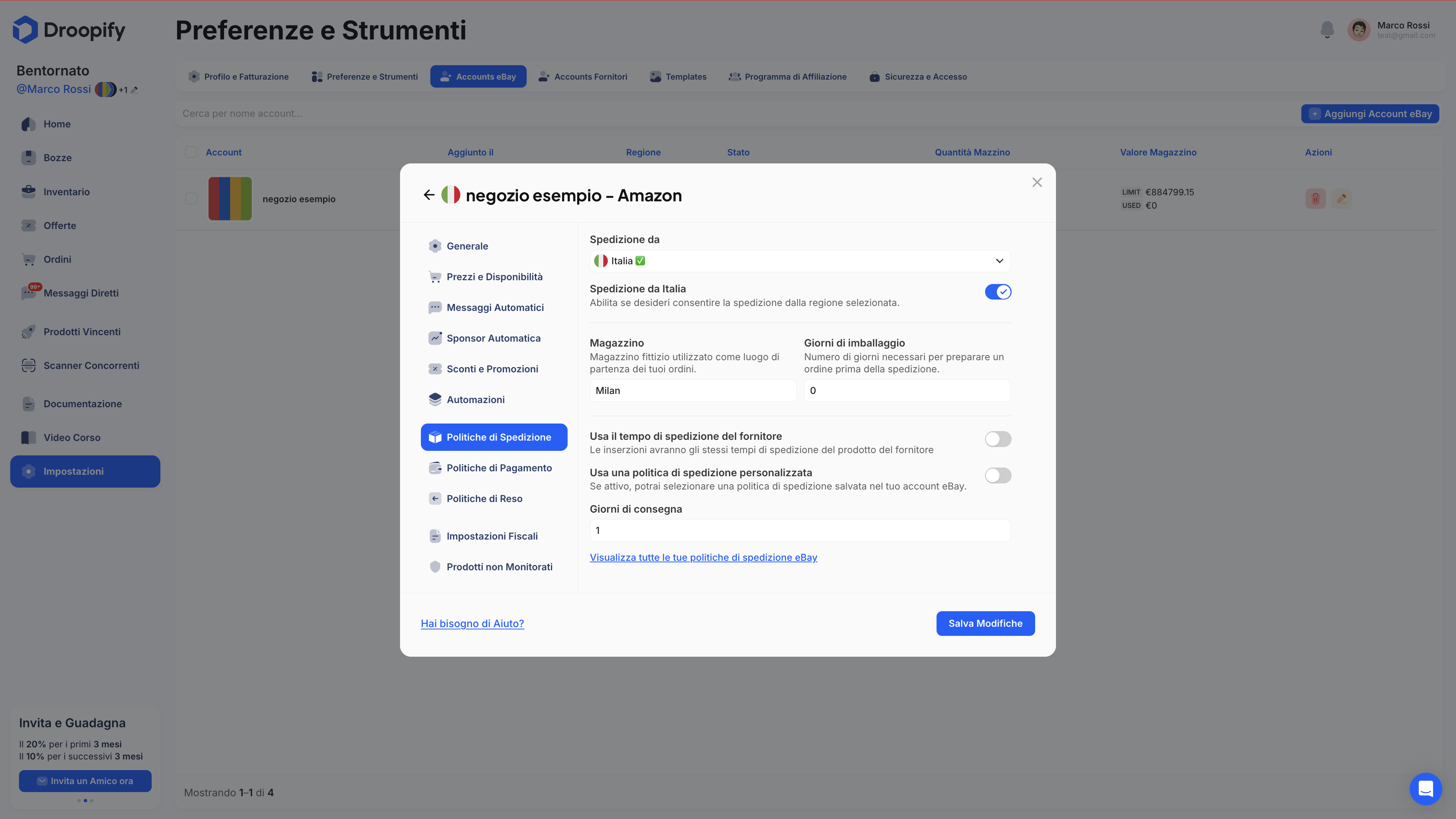 Modificare le impostazioni di un Account eBay collegato a Droopify