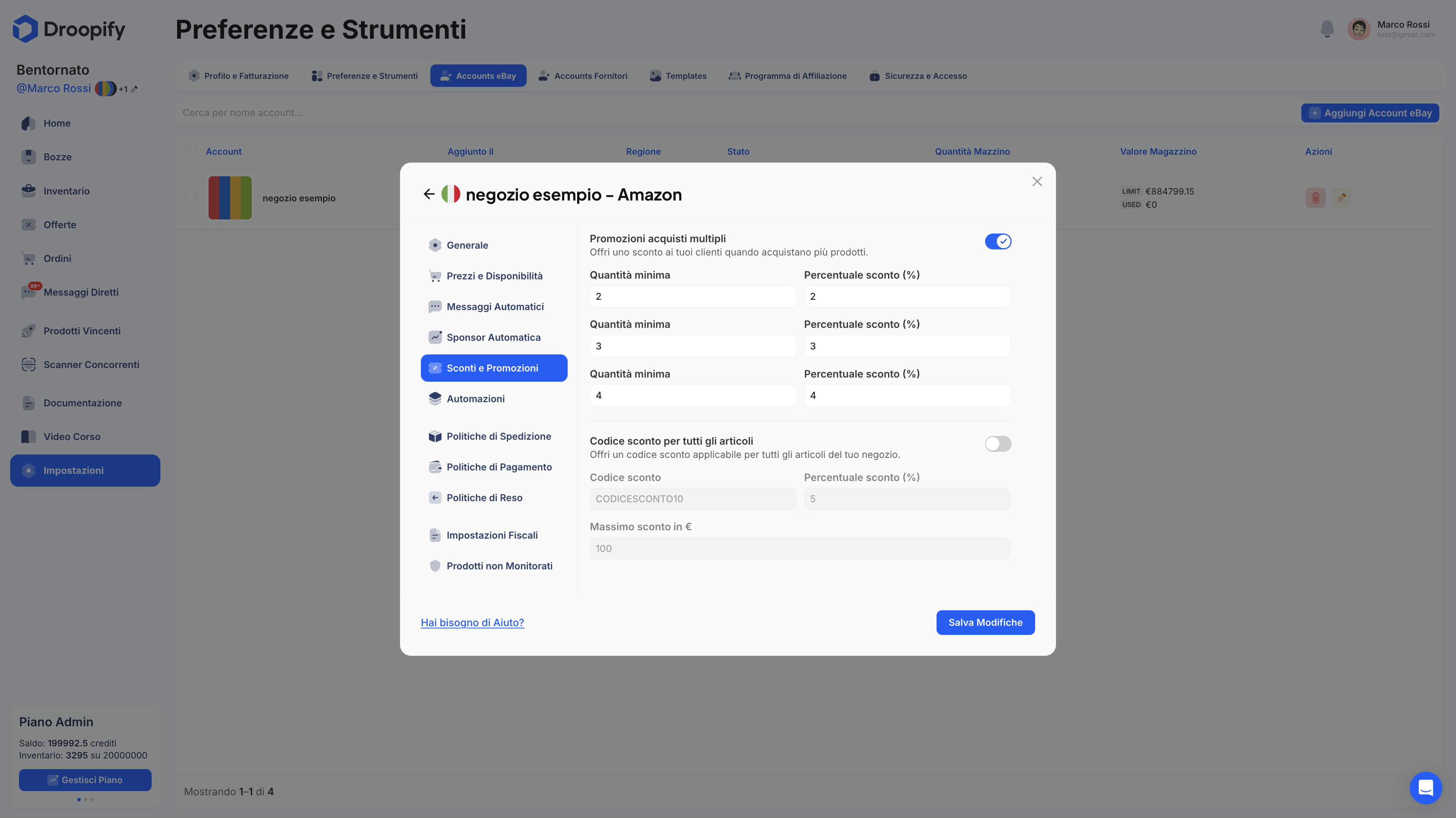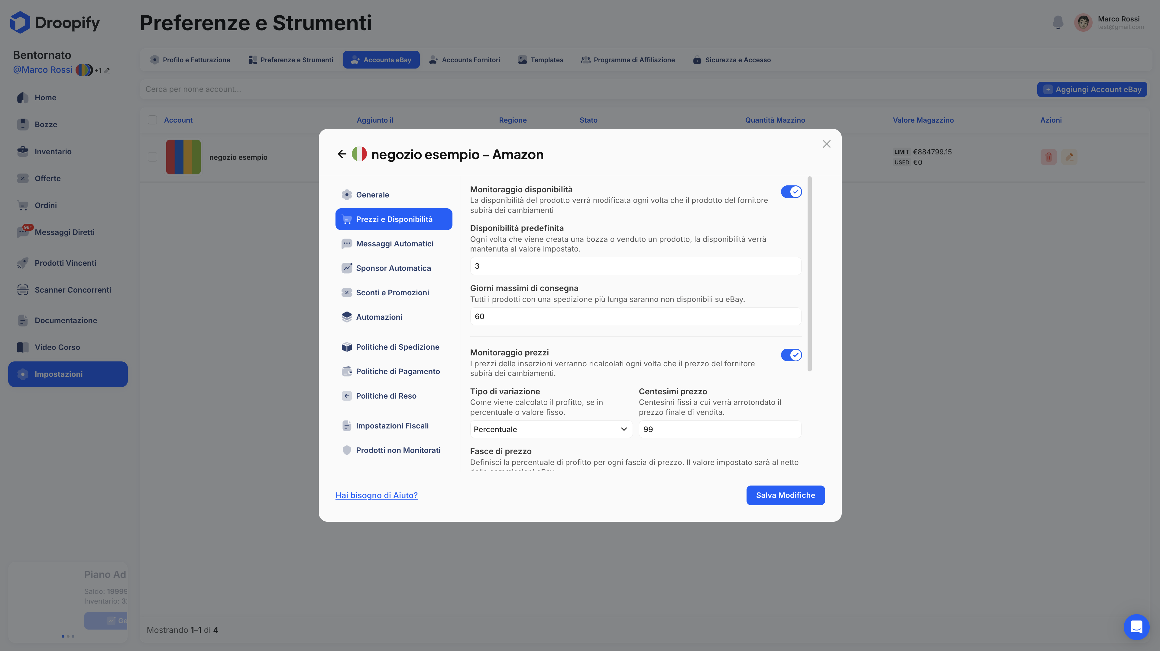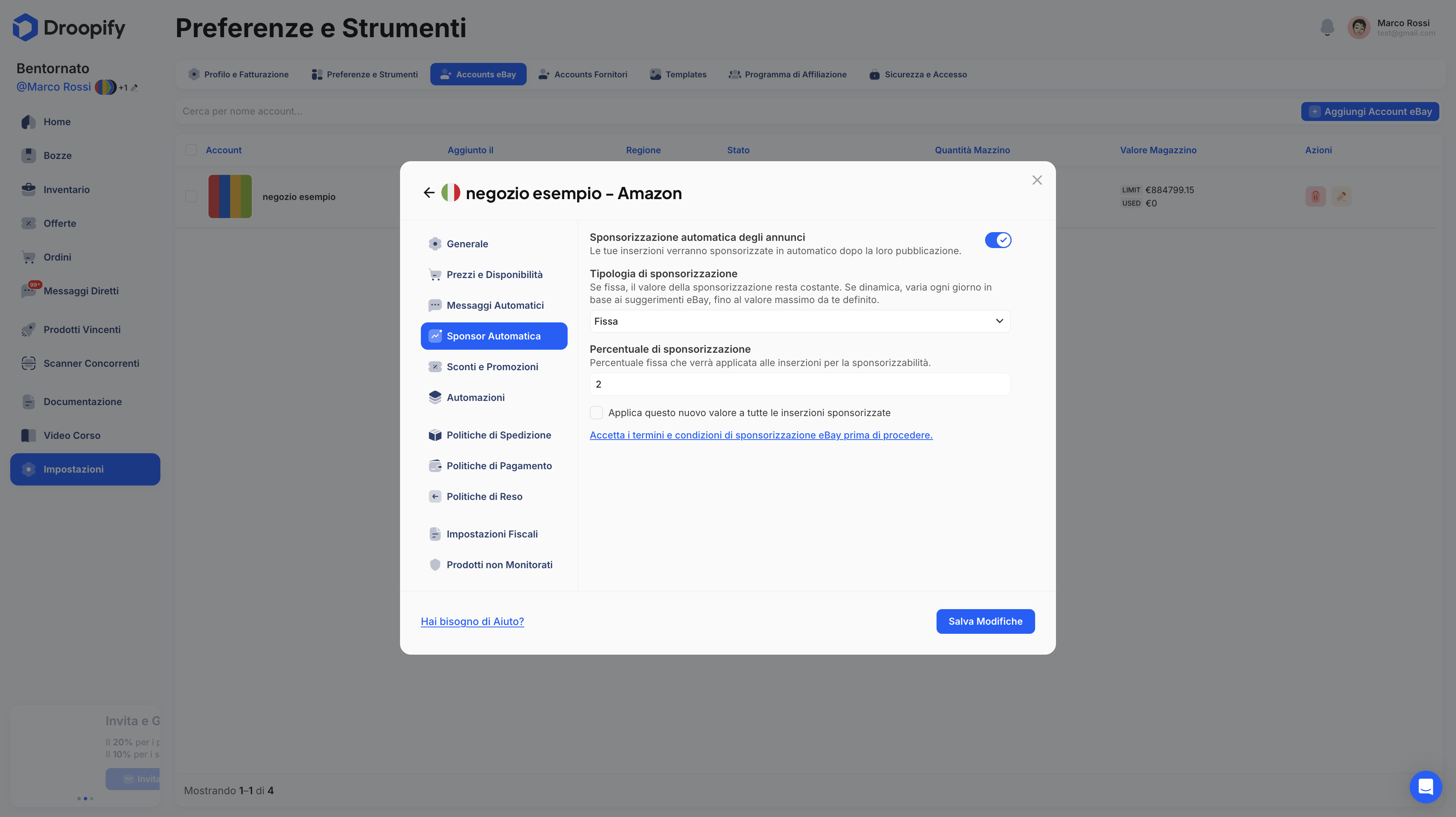 Questa documentazione descrive in modo esaustivo come gestire e modificare le impostazioni di un account eBay collegato a Droopify. Ogni sezione del pannello consente di controllare aspetti chiave del negozio: impostazioni generali, spedizioni, prezzi e profitti, messaggistica automatica, sponsorizzazioni, sconti e promozioni, automazioni operative, magazzino e sincronizzazione dei prodotti non monitorati.