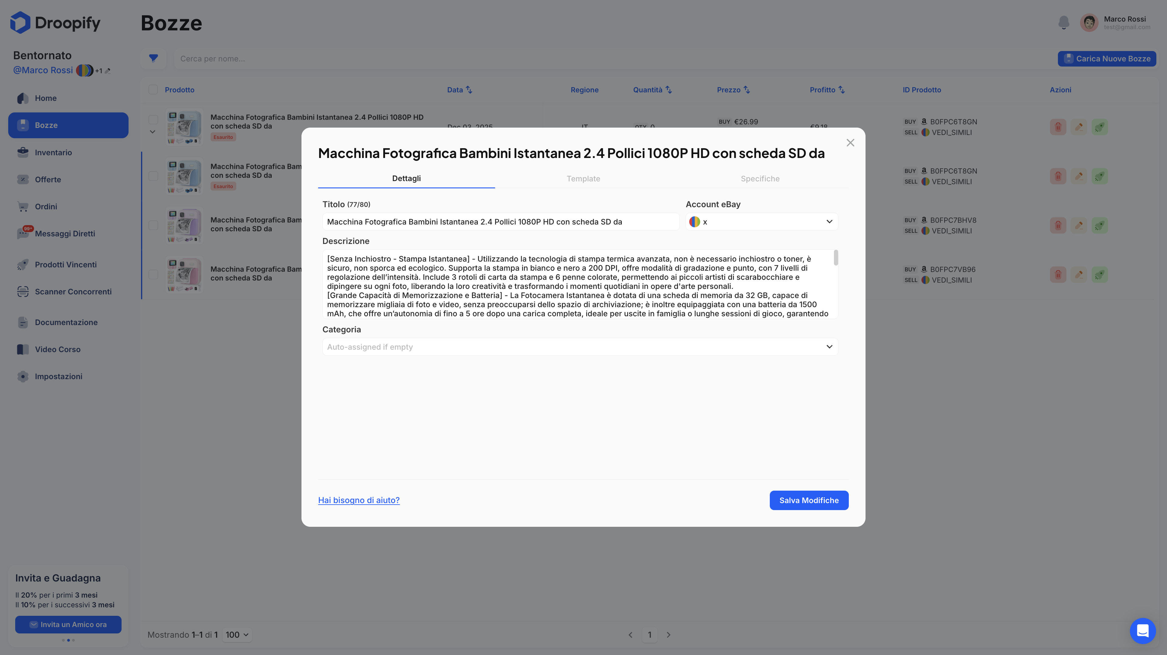 Seguendo questi passaggi, sarai in grado di modificare e gestire in modo efficace le tue Bozze con varianti su Droopify, garantendo che ogni prodotto sia presentato in maniera chiara, coerente e completa ai tuoi clienti.