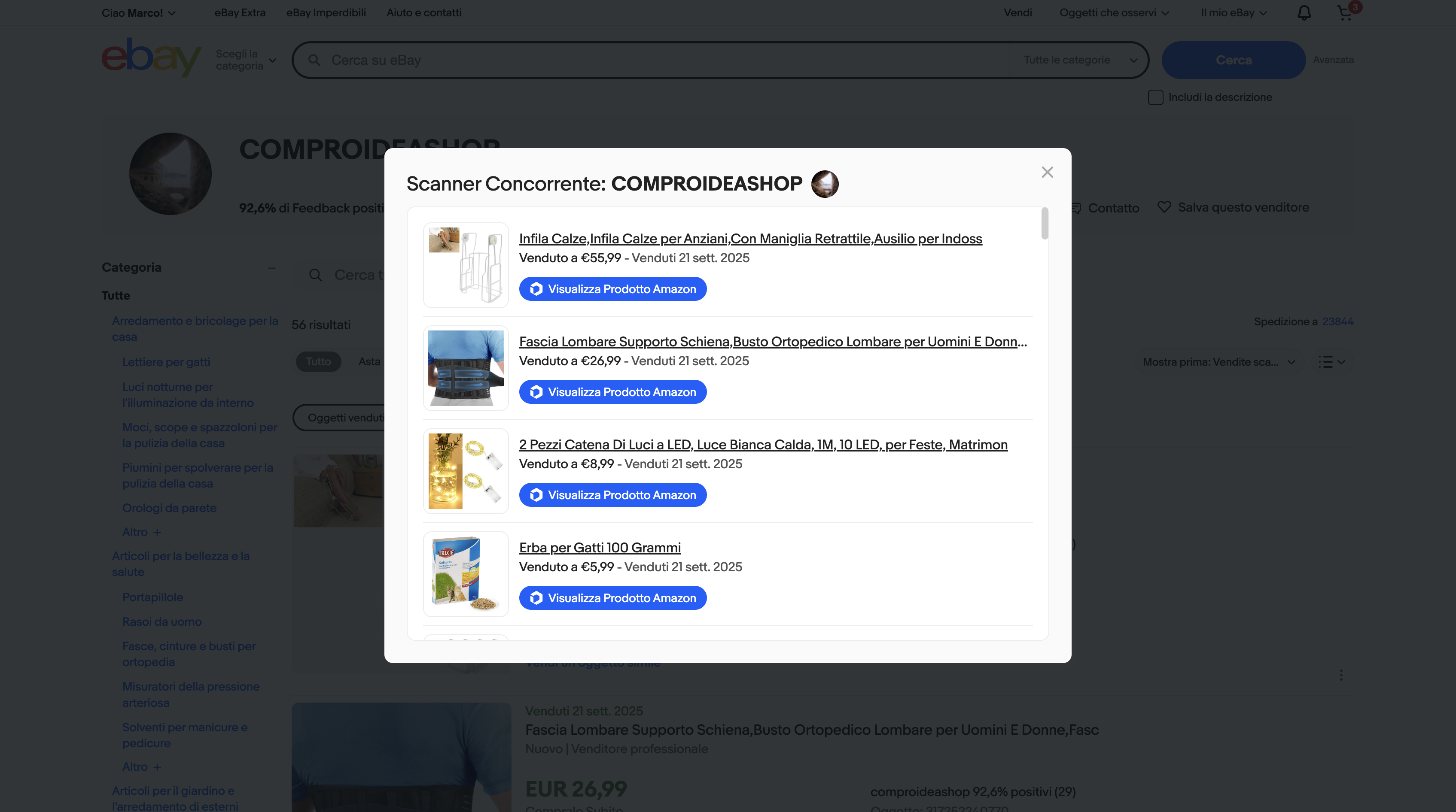 Cliccando sul pulsante, si aprirà la pagina di ricerca Amazon relativa al prodotto venduto dal competitor.